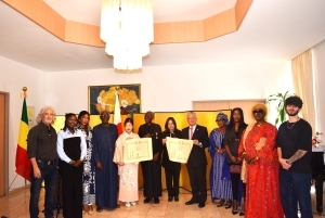 4月8日、赤松武駐セネガル日本大使公邸において、パパ・マガトゥ・ゲイ氏及びアシュワック・ヨニス氏に対する叙勲伝達式を行いました。同セレモニーでは、両者の長年の日本への、そして日本とセネガル間の関係強化に対する功績を、ゆかりの人と一緒にその足跡を懐かしみながら振り返り、感謝の意をお伝えしました。